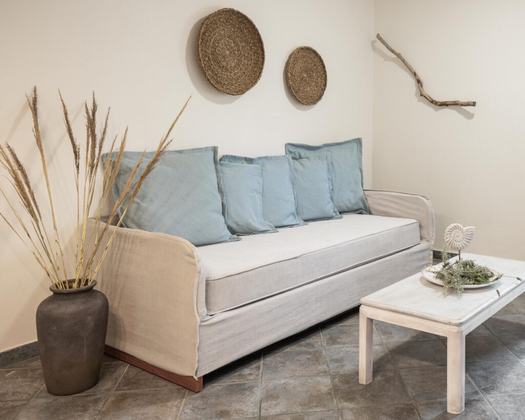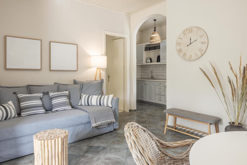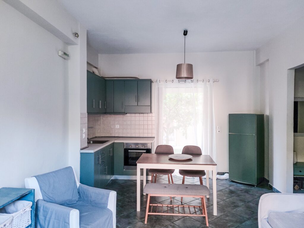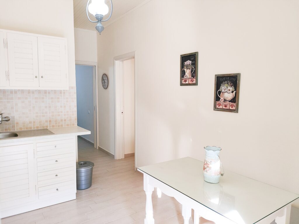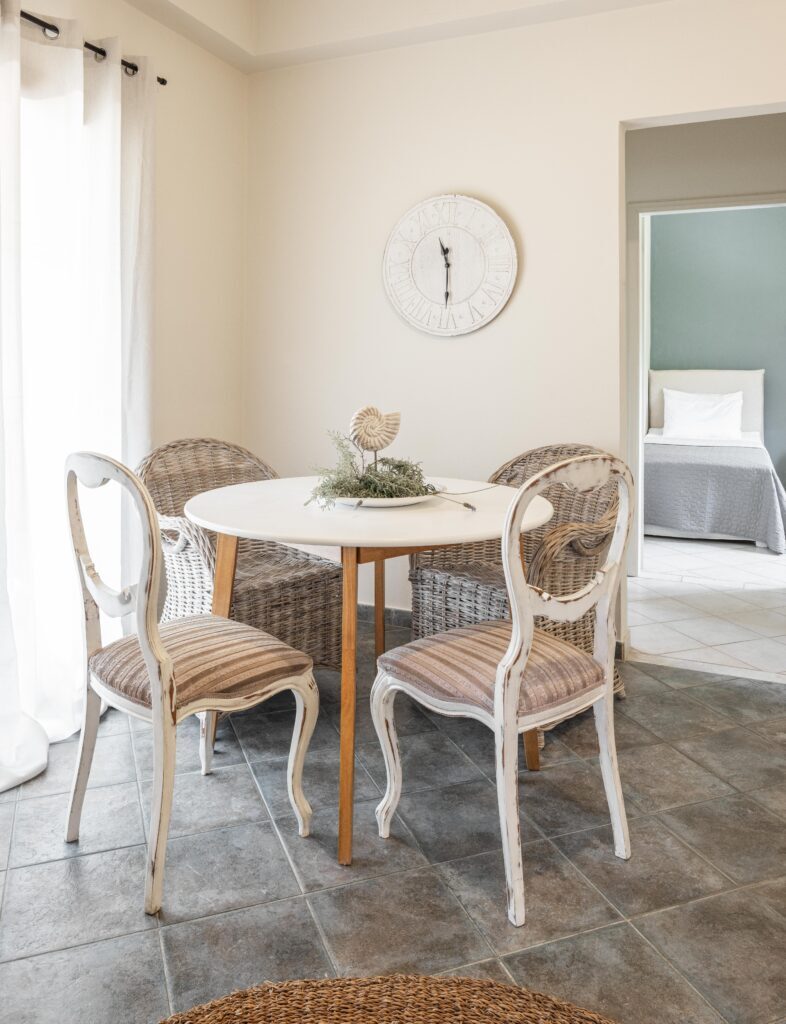 Rooms feature ceiling fan, safety deposit box, kitchenette (fridge, microwave oven in studios/mini oven in apartments, electric kettle, kitchenware), dining table & chairs, shower/WC, hairdryer, balcony/terrace, maid service (2 times per week), towel change (2 times per week), and linen change (1 time per week).