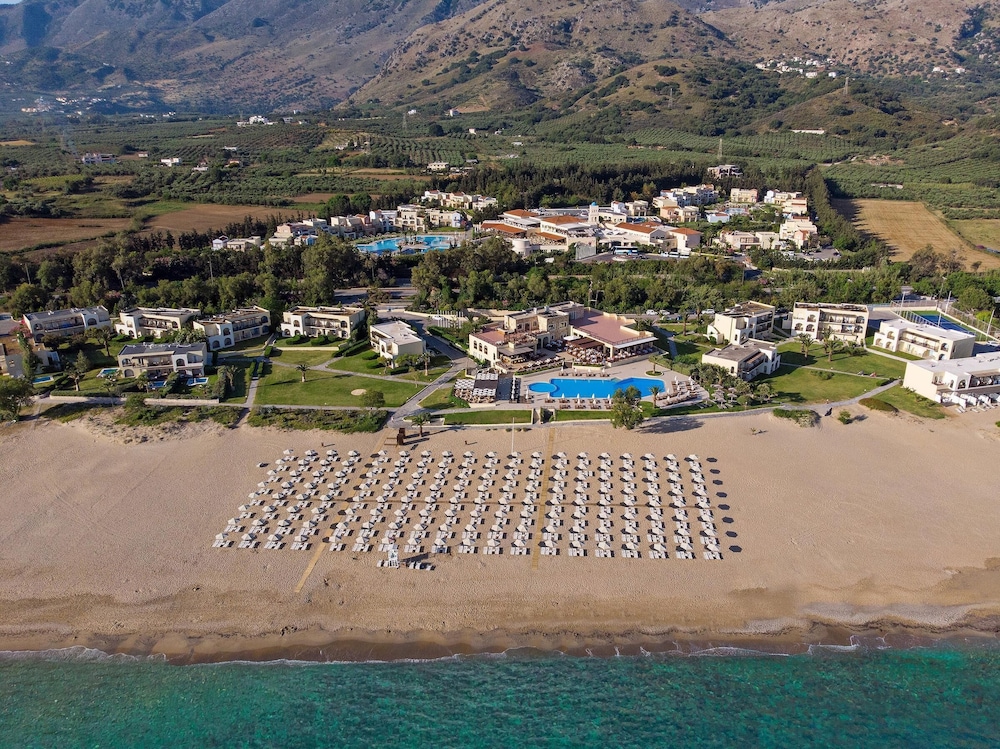 Between Chania and Rethymnon on Crete's north coast lies the island's gem, Georgioupolis. This quaint town offers a relaxed and family-friendly atmosphere, surrounded by stunning natural beauty. On one side of Georgioupolis, you'll find a scenic landscape of beautiful mountains with winding creeks and rivers. On the other side, there's the crystal-clear turquoise sea and expansive beaches. The area is rich with flora and fauna, evidenced by the lively birds chirping in the lush trees and the colorful corals and fish beneath the sea's surface, waiting to be discovered. Diving and snorkeling are popular activities here, and equipment is easily available for rent on-site.